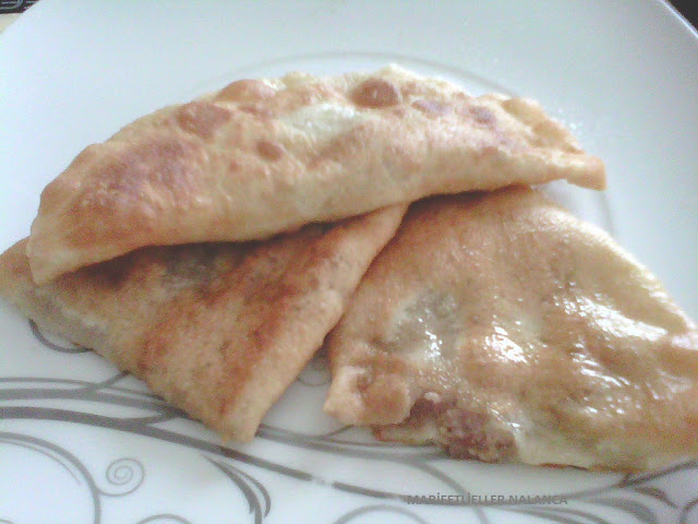 Mayalanan hamuru elinizle toparlayıp unlu tezgaha alın ve Boyuna uzatarak bıçakla 2 parmak kalınlığında kesin ve yuvarlayın.Her bir hamuru unlanmış tezgaha alıp tabak büyüklüğünde açıp kıymalı içi koyup kapatın.bol yağda kızartın.